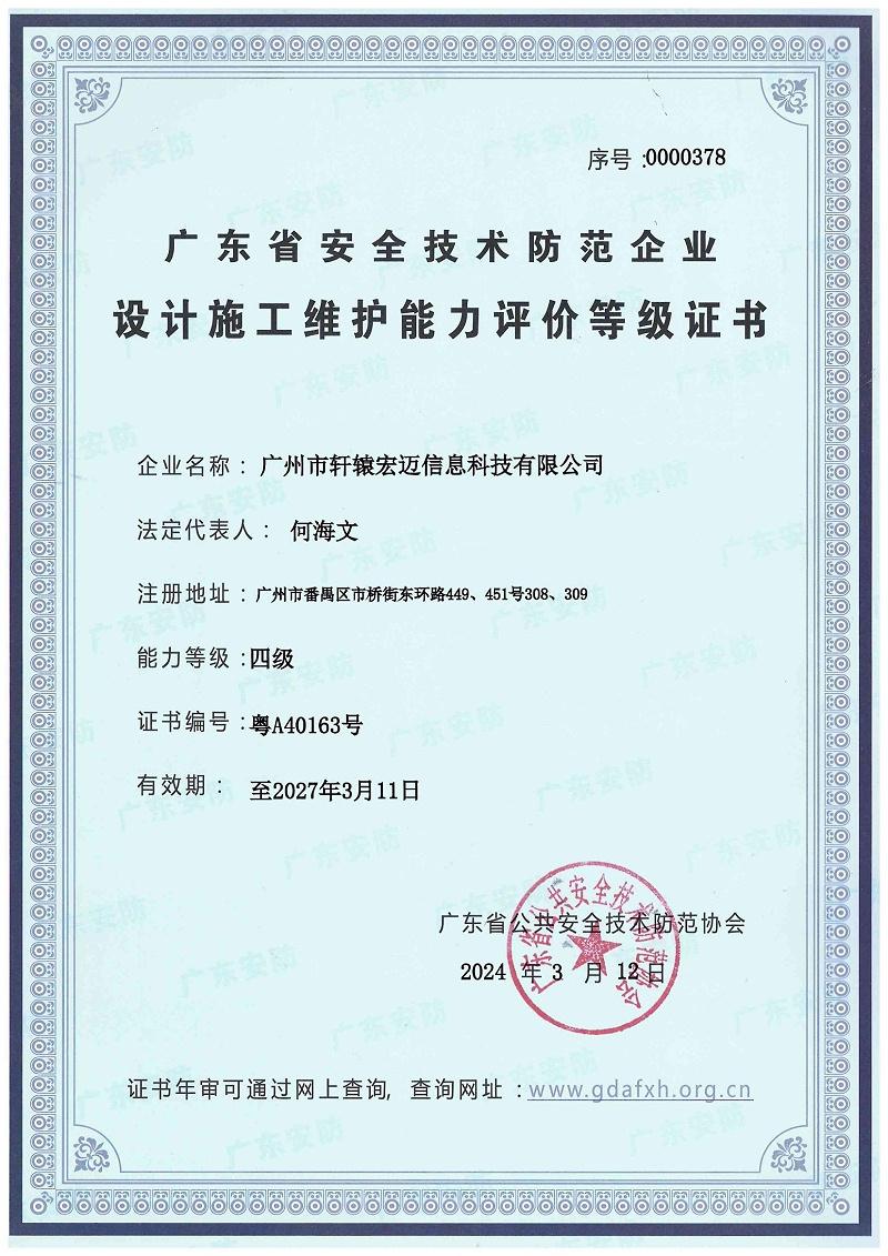 廣東省安防設計施工維護能力評價等級證書