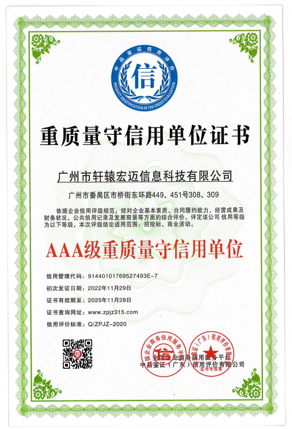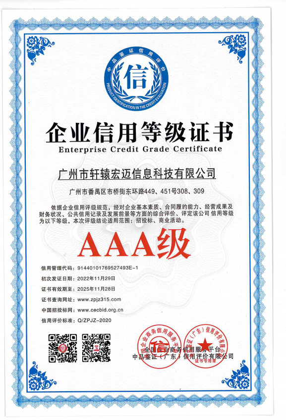 AAA級企業信用等級證書