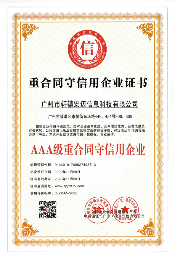 AAA級重合同守信企業證書